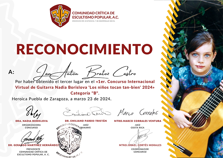 Constancia por el tercer lugar en concurso internacional virtual de guitarra