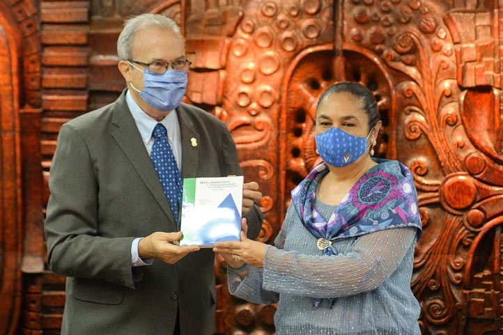 La rectora Sara Ladrón de Guevara recibió de Mario Oliva Suárez el primer ejemplar de Retos y perspectivas de la internacionalización en la Universidad Veracruzana, 2017-2021