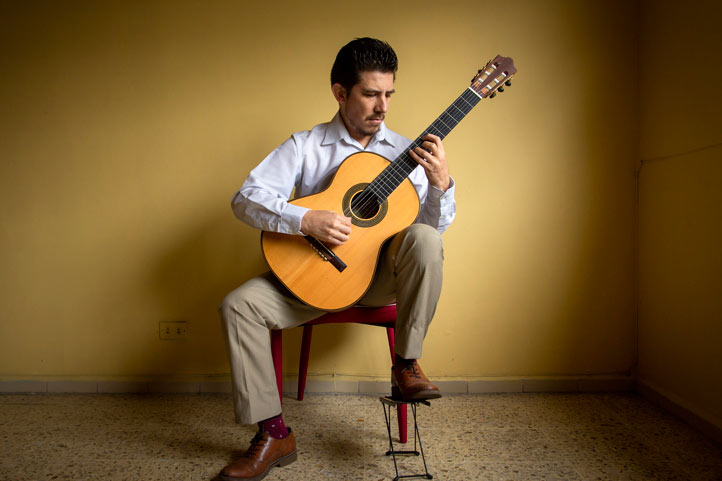 “En Xalapa, la exigencia con respecto a la interpretación en la guitarra es altísima, independientemente de los compositores de enorme nivel con que contamos. Inicié la carrera sobre el instrumento con la idea de la búsqueda creativa. La guitarra es sumamente especial y también lo es la creación de escritura musical para el mismo, por ello me he valido de las capacidades técnicas adquiridas en la Facultad de Música. Al cursar simultáneamente Educación Musical, para la titulación tuve como asesores a Cutberto Córdova y Randall Kohl, esa sinergia me ayudó a concluir el proyecto de generar algunos estudios para guitarra que funcionaron muy bien para obtener mi licenciatura.”