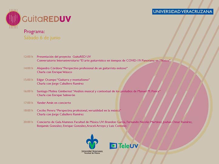 En este conversatorio participarán guitarristas y docentes de Facultad de Música de la UNAM, del Conservatorio Nacional de Música, del Conservatorio de las Rosas de Morelia, la Benemérita Universidad Autónoma de Puebla, la Benito Juárez de Oaxaca, de Guadalajara, Durango y Coahuila. “Tan nutrida y excelente representación de la guitarrística nacional nos comentará qué han hecho ellos en este periodo de contingencia, cuáles han sido los retos y las ventanas de oportunidad que se observan a futuro en esto que se plantea como una opción de educación mixta en que tenemos la oportunidad de trabajar a través de plataformas digitales”, añadió el entrevistado.
