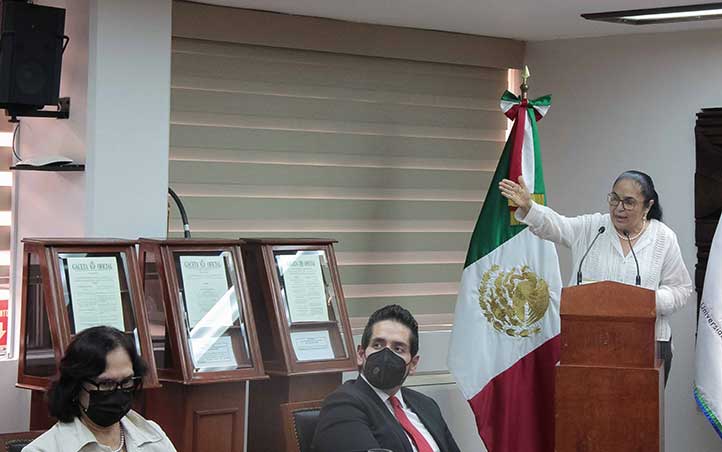 Sara Ladrón de Guevara encabezó la presentación de la obra en la Sala de Juntas de Rectoría