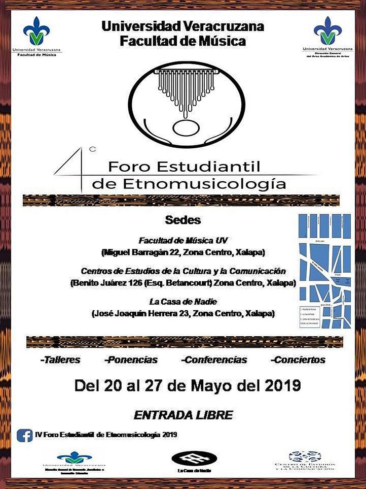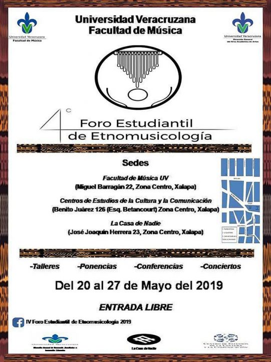 08/05/19, Xalapa, Ver.– El IV Foro Estudiantil de Etnomusicología de la Universidad Veracruzana (UV), que se desarrollará del 20 al 27 de mayo, tendrá tres sedes y la temática se centrará en las diversas expresiones artísticas de carácter étnico; además, el programa propone talleres, conferencias, ponencias y conciertos.