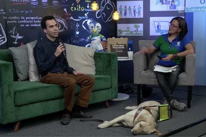 Acompañado de Saidy, su perro guía, Fernando compartió con la audiencia sus primeros acercamientos con los instrumentos musicales a la edad de cuatro años, a través del juego.