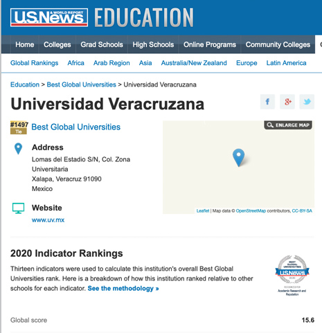 24/04/2020, Xalapa, Ver.- La clasificación de las mejores universidades del mundo que la plataforma de noticias U.S. News & World Report publicó en 2019 colocó a la Universidad Veracruzana (UV) en el duodécimo lugar nacional.