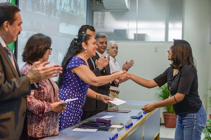 Simbólicamente, tres alumnos de cada una de las áreas académicas de Artes, Humanidades, Ciencias de la Salud, Biológico-Agropecuaria, Técnica y Económico-Administrativa, recibieron de manos de la Rectora un cheque por la cantidad de cuatro mil 800 pesos.