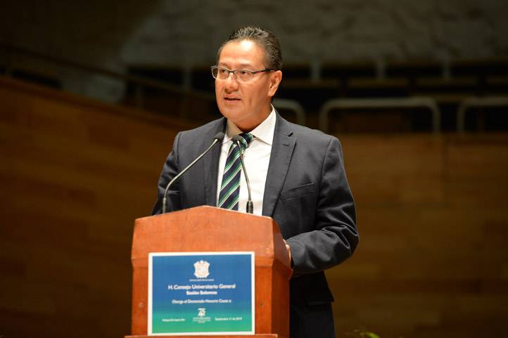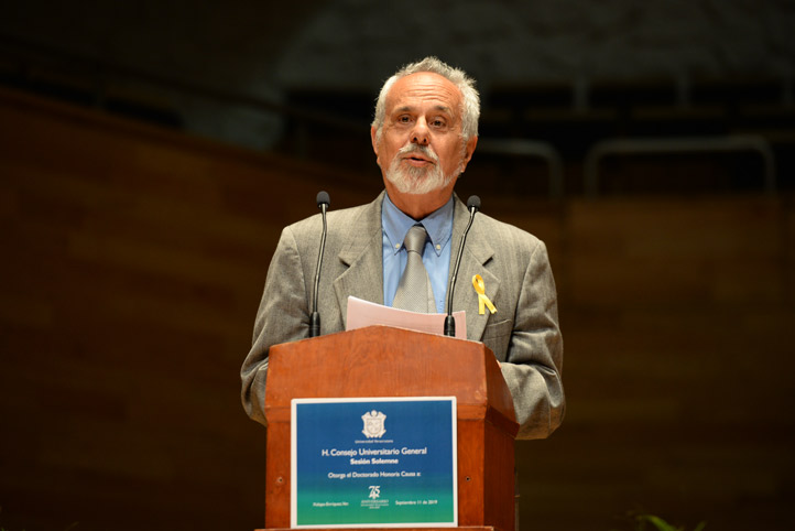 Respecto a la entrega del Doctorado Honoris Causa, añadió: “Hoy nos reúne un nuevo compromiso social: reconocer la labor profesional de todas aquellas personas que han hecho una contribución significativa a la humanidad en el campo de su elección y su desarrollo, en esta ocasión a cuatro distinguidos exponentes de la calidad y la excelencia en distintas ramas del saber: la sociología, la biología, la filosofía y el derecho”.