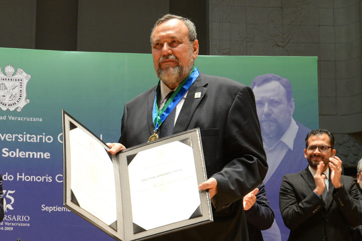 11/09/19 Xalapa, Ver.- En sesión solemne de Consejo Universitario General (CUG) y en el marco de su 75 aniversario, la Universidad Veracruzana (UV) entregó el Doctorado Honoris Causa a los académicos Mauricio Hardie Beuchot Puente, José Ramón Cossío Díaz, Ricardo Guerrero Moreno y Bernard Lahire.