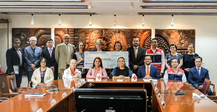 La rectora Sara Ladrón de Guevara hizo la entrega simbólica del cheque a la directora del Sistema para el Desarrollo Integral de la Familia (DIF) Estatal, Verónica Aguilera Tapia, y a la delegada de la Cruz Roja en Veracruz, María de los Ángeles Villa Villafán.
