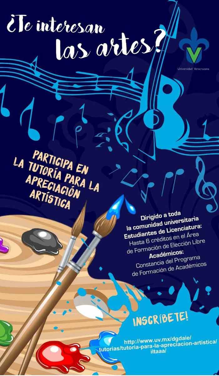 01/08/18, Xalapa, Ver.- La Dirección General de Desarrollo Académico e Innovación Educativa convoca a la comunidad de la Universidad Veracruzana (UV) a participar en la Tutoría para la Apreciación Artística. Los estudiantes de licenciatura pueden obtener hasta seis créditos en el Área de Formación de Elección Libre (AFEL) y los docentes una constancia del Programa de Formación de Académicos.