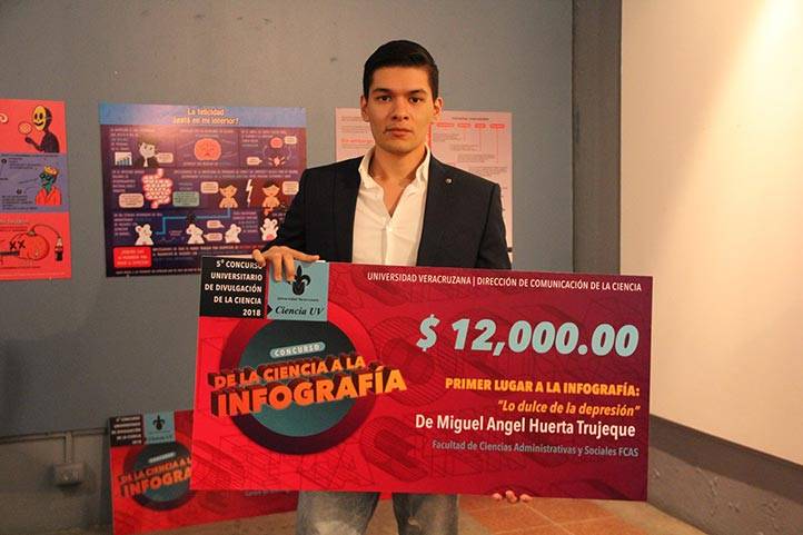 El primer lugar de este concurso en el que los participantes plasmaron una infografía en un cartel, fue para Miguel Ángel Huerta Trujeque, estudiante de la Facultad de Ciencias Administrativas y Sociales (FCAS), por su trabajo “Lo dulce de la depresión”.