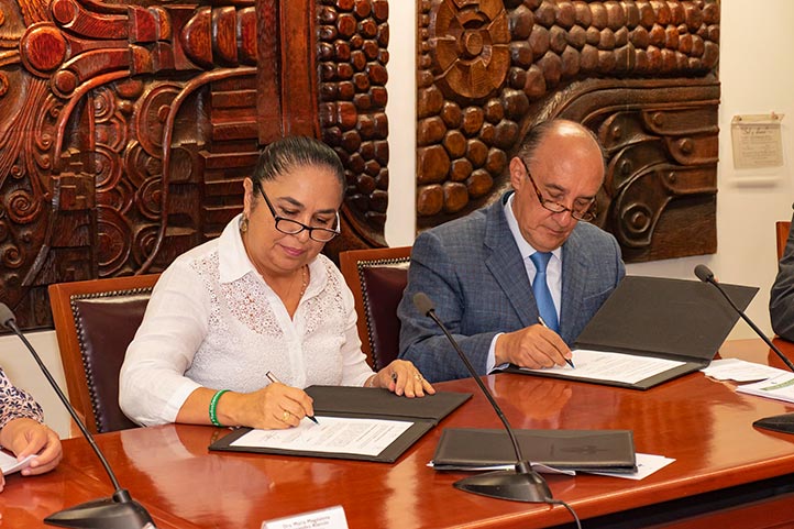 En la firma del convenio estuvieron presentes: Magdalena Hernández Alarcón, Salvador Tapia Spinoso y Octavio Ochoa Contreras, titulares de las secretarías Académica, de Administración y Finanzas, y de Desarrollo Institucional, respectivamente; así como directores generales y de facultades del Área Académica de Ciencias de la Salud.