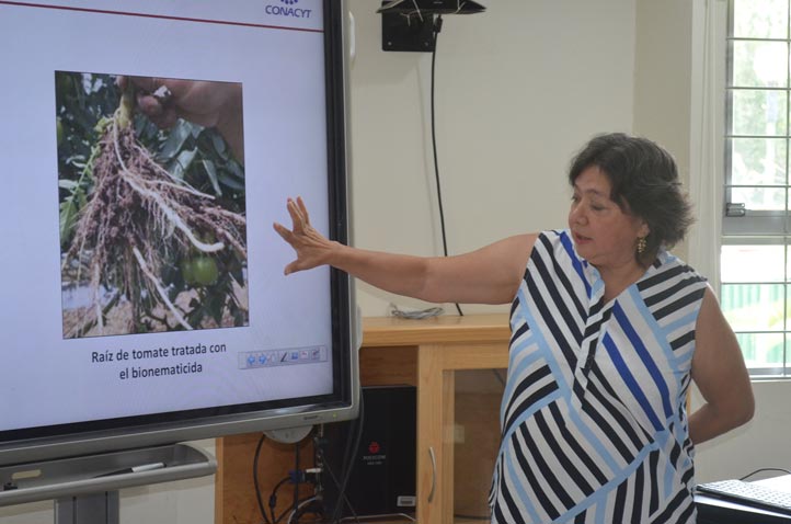 Asimismo, dio detalles sobre los nematodos (animales microscópicos) y la problemática que causan. Groso modo, se trata de microrganismos que habitan en la mayoría de los ecosistemas (agua, suelo y sobre los organismos vivos); por otro lado, enlistó algunos de los cultivos con problemas de nematodos formadores de quistes.