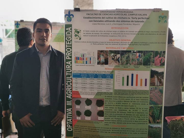 19/01/2020, Xalapa, Ver. Miguel Ángel Domínguez Fernández y Luis López Mendoza, estudiantes de la Facultad de Ciencias Agrícolas de la Universidad Veracruzana (UV), analizaron el efecto de lixiviados a base de heces de borrego y de pulpa de café utilizados como fertilizantes sobre la morfología y producción de chícharo early perfection, bajo los sistemas de tutorado –actividad que consiste en brindar soporte a los cultivos–, rafia agrícola y espaldera.