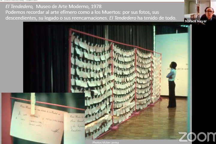Como parte de la charla, compartió con los asistentes tres de sus proyectos que conjuntan las ideas del arte feminista: El Tendedero (1978), Maternidades secuestradas y Archiva.