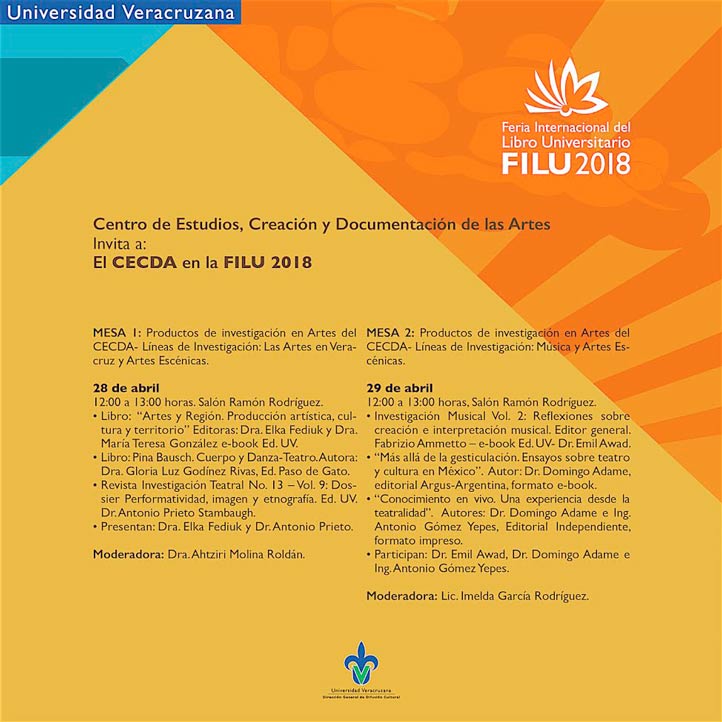 27/04/18, Xalapa, Ver.- El Centro de Estudios, Creación y Documentación de las Artes (CECDA) de la Universidad Veracruzana (UV) tendrá una amplia participación dentro de la XXV Feria Internacional del Libro Universitario (FILU), que se realizará del 27 de abril al 6 de mayo en diversas sedes de Xalapa.
