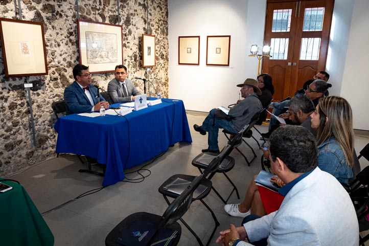 Rafael Alcalá Hinojosa, titular de la DGDC, y Rey Alejandro Conde Valdivia, director de Grupos Musicales, presentaron en rueda de prensa el Plan de Trabajo conformado por cuatro ejes rectores, la tarde del jueves 8 de agosto en la Galería Universitaria “Ramón Alva de la Canal”.