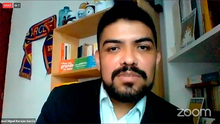 06/11/2020, Xalapa, Ver.- José Miguel Barajas García, maestro en Literatura Mexicana por la Universidad Veracruzana (UV), comentó que los traductores constantemente tienen que elegir las palabras de sus traducciones pues cada una tiene como mínimo dos significados, por lo cual deben tomar una decisión; es como tocar un instrumento, se elige una clave para sobre esa interpretar, asumir y ser consciente de las decisiones tomadas.