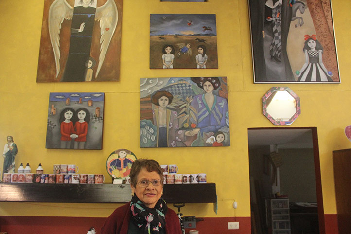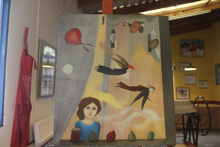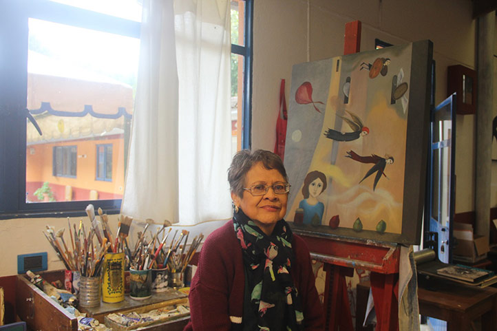 Dentro de su taller, ubicado en una de las zonas de bosque de niebla circunvecinas a Xalapa, a través de pinturas y grabados niños rodeados por escenarios mágicos y fantásticos, la sonrisa de la pintora se convierte en voz y con gusto comparte su historia.