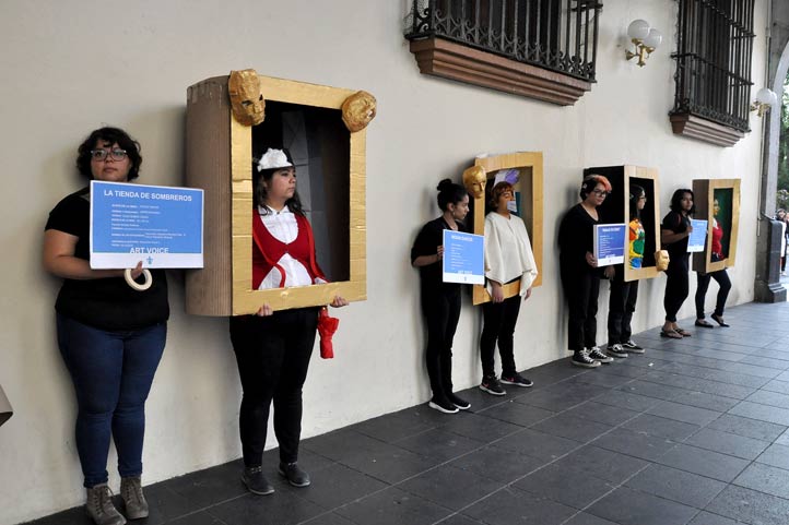 - Universitarios de primer semestre de la Facultad de Artes Plásticas realizaron una exhibición de cuadros vivientes en el exterior del Palacio de Gobierno Estatal