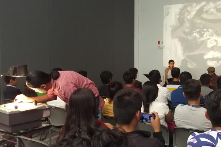 - Octavio Sánchez pinta sobre el proyector, al mismo tiempo que Stephanie Monterrosas y Gabino Espinoza ejecutan una melodía