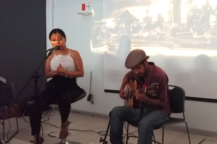 23/09/2019, Orizaba, Ver.- En la Unidad de Servicios Bibliotecarios y de Información (USBI) de la Universidad Veracruzana (UV), campus Ixtaczoquitlán, se llevó a cabo el espectáculo Música y cine a mano, el pasado 19 de septiembre; la parte musical fue brindada por Stephanie Monterrosas en la voz y de Gabino Espinoza en la guitarra, quienes interpretaron canciones latinoamericanas, entre ellas Bésame mucho, Lágrimas negras, Gracias a la vida, Farolito y Veracruz.