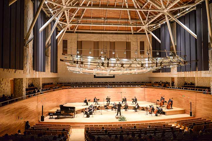 La sala tiene disposición de mil 200 lugares, de los cuales el público sólo ocupó poco más de 240 y entre cada espacio hubo un distanciamiento de un metro y medio. Mientras tanto, en el escenario sólo fueron dispuestos 17 lugares para igual número de músicos.