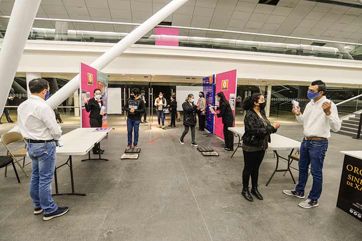 Minutos después de las 20:00 horas, los asistentes empezaron a ingresar al recinto cultural, después de ser recibidos por dos filtros sanitarios consistentes en desinfección de zapatos, gel antibacterial para manos y toma de temperatura; además, se solicitó el uso del cubrebocas, como lo estipula el protocolo sanitario