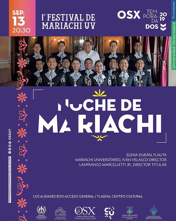 08/09/2019, Xalapa, Ver.- La Orquesta Sinfónica de Xalapa (OSX) de la Universidad Veracruzana (UV) anuncia el concierto Noche mexicana para conmemorar las Fiestas Patrias, bajo la dirección de Lanfranco Marcelletti y con solistas de la talla de Elena Durán –flautista– y el Mariachi Universitario. La cita es el viernes 13 de septiembre a las 20:30 horas, en la Sala de Conciertos Tlaqná, Centro Cultural.