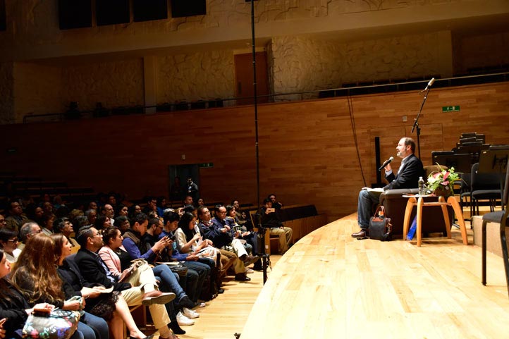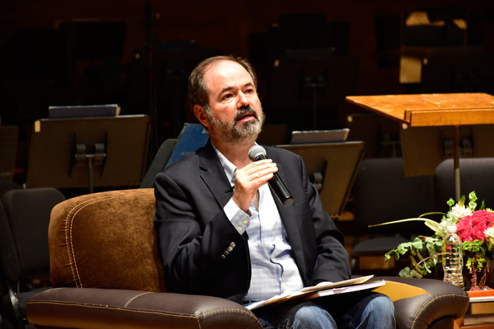28/04/18, Xalapa, Ver.- La música es un mecanismo de relojería que puede admirarse como algo que puntualmente da la hora, no definida sino misteriosa, puede ser una hora futura, puede ser la recuperación de una hora pretérita o puede ser todos los tiempos en un solo tiempo, expresó Juan Villoro, durante la charla previa al concierto Música y poder. El sonido y la furia”, que ofreció la Orquesta Sinfónica de Xalapa (OSX).