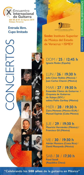 También actuarán el Ensamble Clásico de Guitarras y la Orquesta de Guitarras adscrita a la Secretaría de Educación de Veracruz, con el afamado connacional Pablo Garibay como solista. El recital de cierre tendrá la actuación de una de las más interesantes personalidades en el contexto de la guitarra internacional, el checo Pavel Steidl.