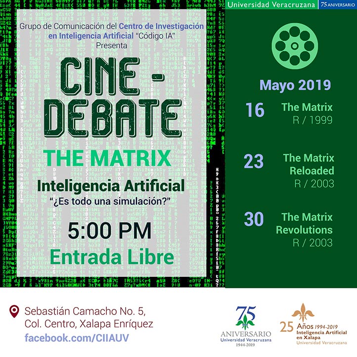 16/05/19, Xalapa, Ver.- El Centro de Investigación en Inteligencia Artificial (CIIA) de la Universidad Veracruzana (UV) realizará los días 16, 23 y 30 de mayo el Cine-Debate The Matrix. Inteligencia Artificial. ¿Es todo una simulación?, dentro del que se analizarán las tres películas que componen la saga dirigida por las hermanas Lana y Lilly Wachowski.