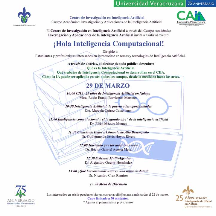 23/03/19, Xalapa, Ver.- El Centro de Investigación en Inteligencia Artificial (CIIA) de la Universidad Veracruzana (UV) llevará a cabo el 29 de marzo el evento académico “¡Hola inteligencia computacional!”, que tiene por objetivo dar a conocer las líneas de generación y aplicación del conocimiento y los trabajos de investigación que realizan los académicos del centro.