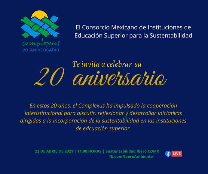 21/04/2021, Xalapa, Ver.- El Consorcio Mexicano de Instituciones de Educación Superior para la Sustentabilidad (Complexus) invita a la celebración de su 20 aniversario, a realizarse el 22 de abril. En la que se firmará un nuevo convenio de colaboración, se realizará una conferencia magistral a cargo de Boaventura de Sousa y un panel en el que expertos reflexionarán sobre la visión de futuro de este consorcio.
