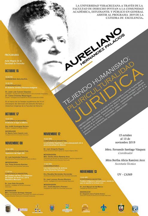 08/10/2019, Xalapa, Ver.- La Universidad Veracruzana (UV), a través de la Facultad de Derecho (FD), ha dado a conocer el programa para la Cátedra de Excelencia “Aureliano Hernández Palacios”, que en su edición correspondiente a 2019 se efectuará del 15 de octubre al 13 de noviembre.