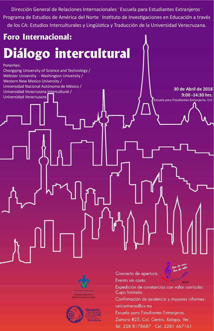 24/04/18, Xalapa, Ver.- La Universidad Veracruzana (UV), a través de la Dirección General de Relaciones Internacionales (DGRI), la Escuela para Estudiantes Extranjeros (EEE), el Programa de Estudios de América del Norte y el Instituto de Investigaciones en Educación, realizarán el Foro Internacional: Diálogo Intercultural, el lunes 30 de abril en las instalaciones de la EEE de 9:00 a 14:30 horas.