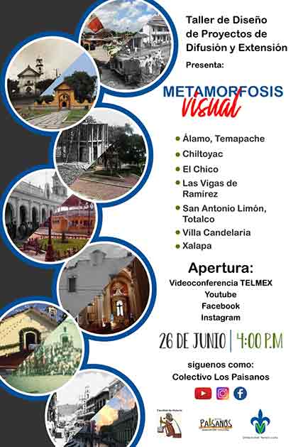 25/06/2020, Xalapa, Ver.- La Facultad de Historia de la Universidad Veracruzana (UV), a través del Taller de Diseño de Proyectos de Difusión y Extensión, invita al evento “Metamorfosis visual”, el 26 de junio a partir de las 16:00 horas por Videoconferencia Telmex, YouTube, Facebook e Instagram.