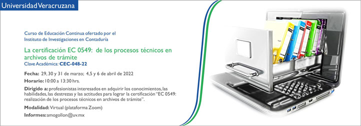23/03/2022, Xalapa, Ver.- El Instituto de Investigaciones en Contaduría (IIC) de la Universidad Veracruzana (UV) oferta el curso “La certificación EC 0549: de los procesos técnicos en archivos de trámite”, el cual será impartido por Ramón Aguilera Murguía, director general de la Escuela Mexicana de Archivos.