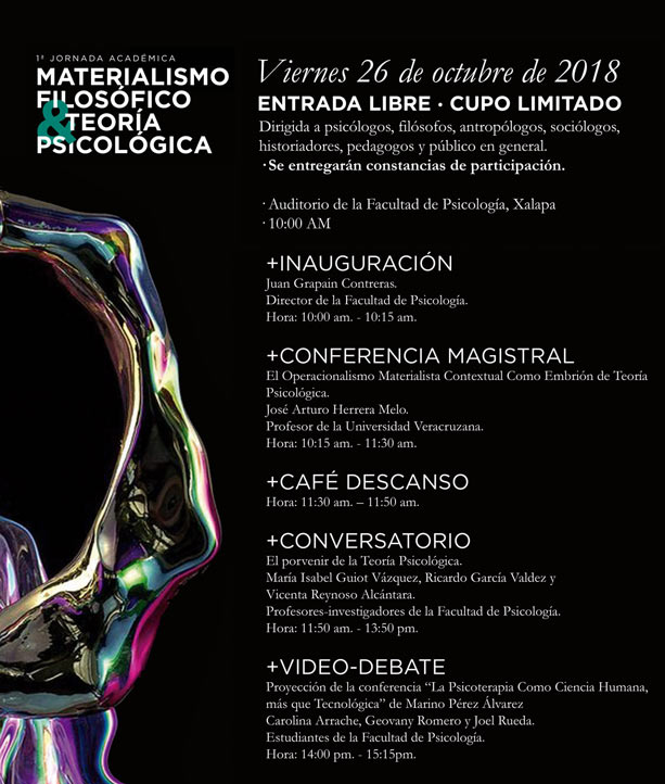 20/10/18, Xalapa, Ver.- La Facultad de Psicología de la Universidad Veracruzana (UV) realizará la 1ª. Jornada Académica “Materialismo filosófico y teoría psicológica”, el viernes 26 de octubre a las 10:00 horas, en el auditorio de la propia entidad académica.