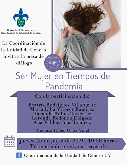 24/06/2020, Xalapa, Ver.- Ser mujer en tiempos de pandemia” es el tema de la mesa de diálogo que este jueves 25 de junio será transmitida en vivo, a partir de las 10:00 horas, en la página de Facebook de la Coordinación de la Unidad de Género de la Universidad Veracruzana (UV).