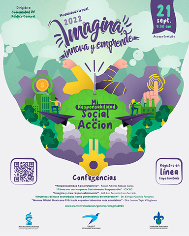 14/08/2022, Xalapa, Ver.- La Oficina de Transferencia de Tecnología de la Dirección General de Vinculación (DGV) de la Universidad Veracruzana (UV) convoca al evento Imagina, Innova y Emprende edición 2022 virtual, cuyo tema será “Responsabilidad Social Empresarial”. La cita es el próximo 21 de septiembre, por las plataformas Zoom y Facebook Live.