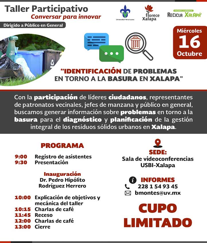 14/10/2019, Xalapa, Ver.- La Universidad Veracruzana (UV), como institución que diseña actualmente el Programa Municipal de Gestión Integral de los Residuos para el municipio de Xalapa, convoca a líderes ciudadanos, patronatos vecinales, jefes de manzana y público en general, a participar en el taller “Identificación de problemas en torno a la basura en Xalapa”.