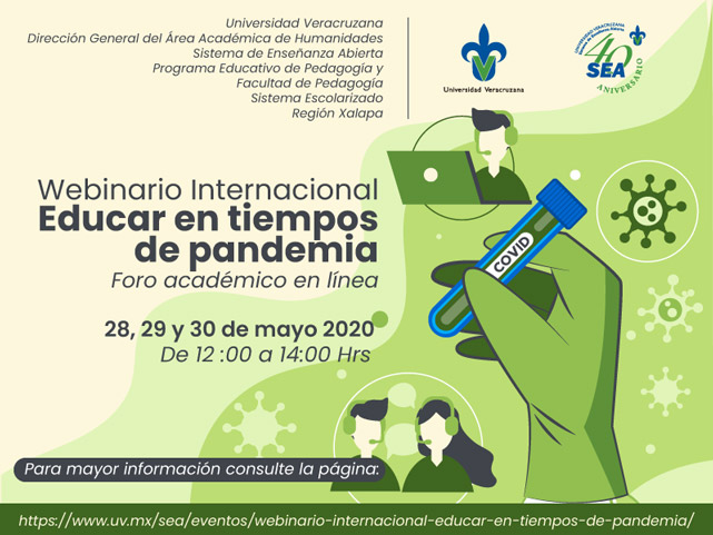 25/05/2020, Xalapa, Ver.- La pandemia por la enfermedad de Covid-19 es un evento que impacta a muchos niveles y afecta directamente a la educación, por tal motivo la Universidad Veracruzana (UV), a través de la Dirección General del Área Académica de Humanidades, el programa educativo de Pedagogía del Sistema de Enseñanza Abierta (SEA) y la Facultad de Pedagogía, realizarán el Foro Académico en Línea “Educar en tiempos de pandemia”.