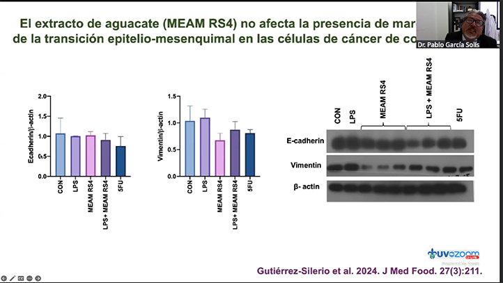 También puntualizó que extractos de aguacate reducen la viabilidad de generación de células de cáncer de colon HT29; sin embargo, advirtió que se debe ser cauto con las conclusiones dado que, al cambiar la concentración de los compuestos, cambian sus reacciones químicas en las muestras.