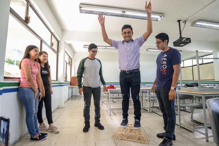 En esta última, cada uno de los estudiantes se posó sobre las estructuras, en puntos específicos previamente probados y analizados para evitar que colapsaran. El peso máximo que soportaron fue mayor a 80 kilogramos.
