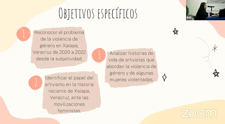 La segunda participación del primer día de actividades fue de Martha Ramírez y llevó por título “Activismo: Una respuesta a la violencia de género en Xalapa, Veracruz, durante el confinamiento por la pandemia de la COVID-19 (2020-2022)”, cuya dirección está a cargo del rector de la UV, en calidad de profesor-investigador del IIHS, Martín Aguilar Sánchez.