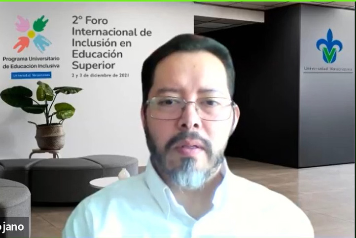 Rafael Rojano expuso el tema “Logros en la inclusión de personas sordas en la Universidad Veracruzana” y mencionó que esta casa de estudios aplicó por primera vez en 2019, de manera formal, un examen de ingreso en lengua de señas mexicana.