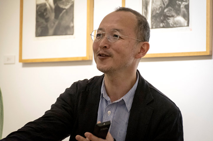 Brauchli leyó una breve ficha curricular del artista nipón y comentó que su trabajo es un ritual, desde la toma precisa de la imagen, la elaboración artesanal del papel y el uso de la técnica paladio platino para la impresión de la imagen.
