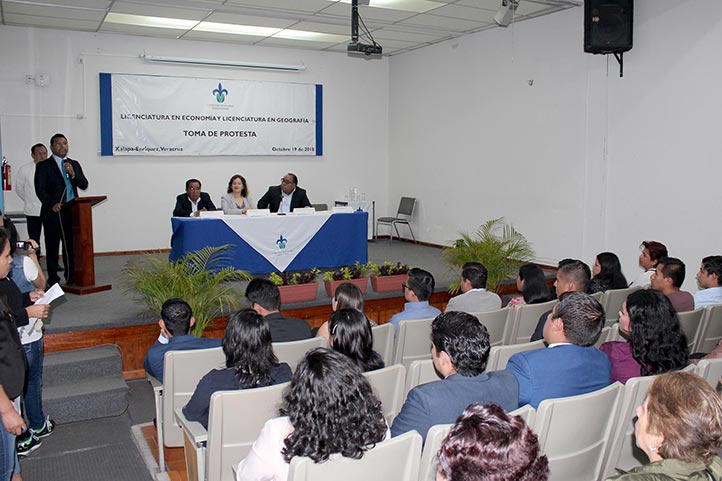 28/10/18, Xalapa, Ver.- En una ceremonia protocolaria, egresados de los programas educativos (PE) de Geografía y Economía de la Universidad Veracruzana (UV) rindieron protesta ante autoridades universitarias y se comprometieron a honrar a su alma máter, ejercer la profesión con honorabilidad y contribuir en la solución de problemáticas que aquejan a la sociedad.