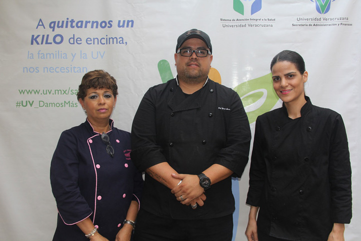 Xalapa, Ver. 9/06/2016.- Una alimentación balanceada es indispensable para llevar una vida saludable, coincidieron Danaé del Valle Garrido, Hilmar Armenta Rodríguez y María Dolores Sánchez Suárez, profesores y chefs del Taller Conservación y Preparación de Alimentos de la Escuela Industrial “Concepción Quirós Pérez”, durante la exhibición de refrigerios saludables organizada por el Sistema de Atención Integral a la Salud de la Universidad Veracruzana (SAISUV).