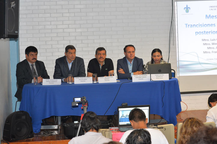 16/10/18, Xalapa, Ver.- En el marco de la XI Semana de la Sociología se desarrolló la mesa redonda “Transiciones políticas y sociales después del 1 de julio”, en la que participaron Wenceslao Vargas Márquez, articulista en varios medios de comunicación; Luis Gerardo Martínez García, editorialista y columnista; Antonio Pino Méndez, docente de la Facultad de Pedagogía, y Francisco López Castellanos, profesor de la Facultad de Ciencias Administrativas y Sociales.
